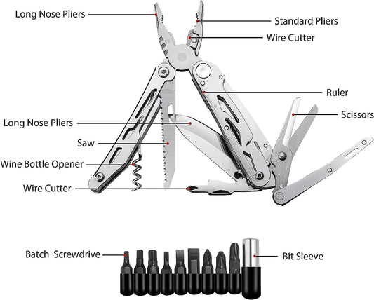 RoverTac Multi Tool Pocket Knife Tactical Camping Survival Knife Gifts for Men Dad Husband 18 in 1 Multitool Pliers Scissors Saw Corkscrew Bottle Opener 9-pack Screwdrivers Safety Lock Nylon Sheath